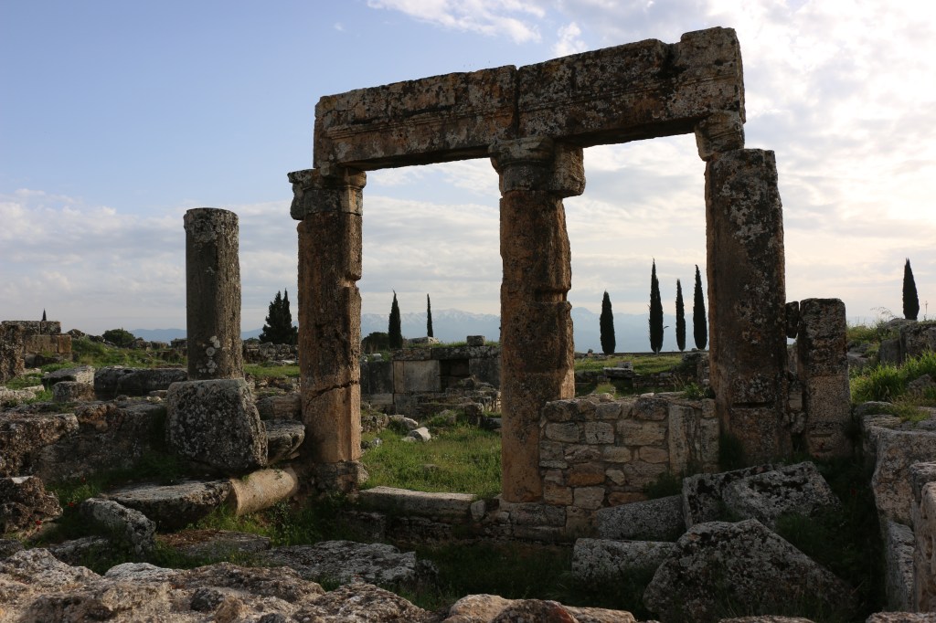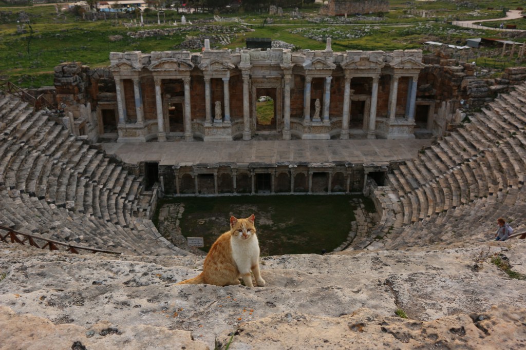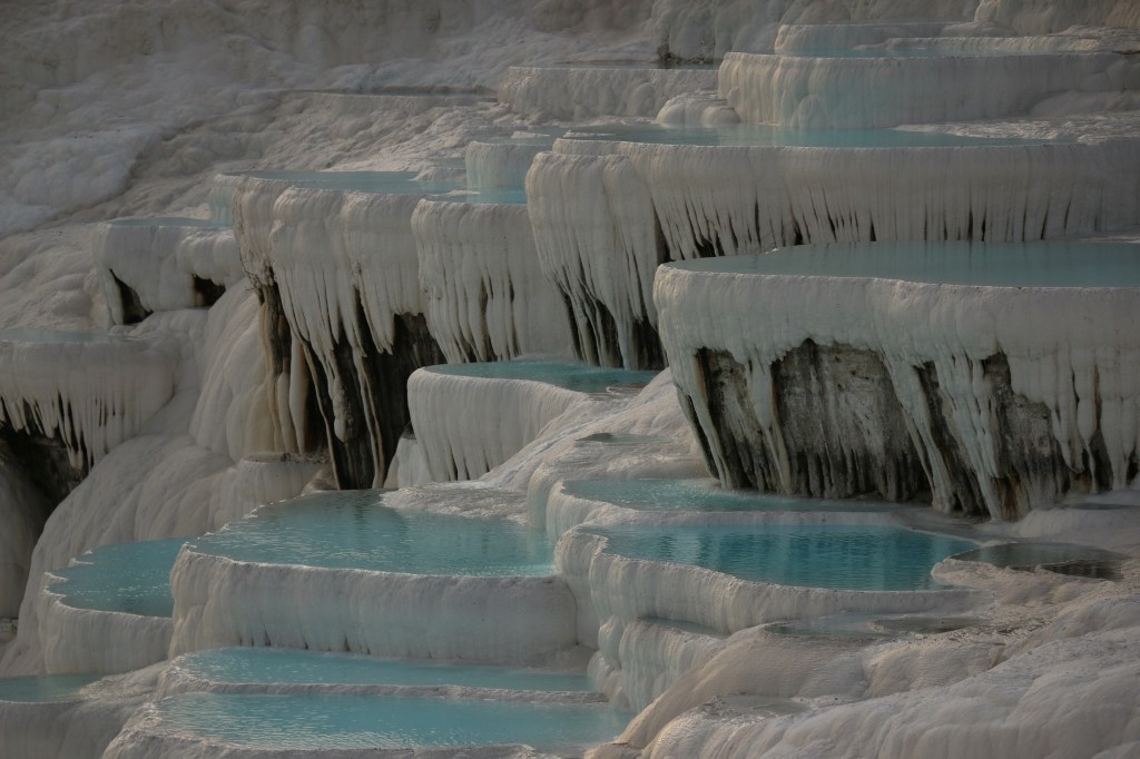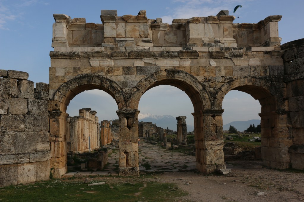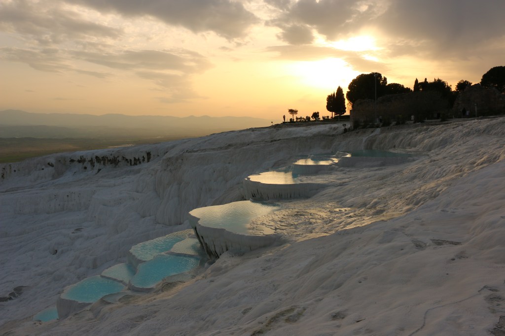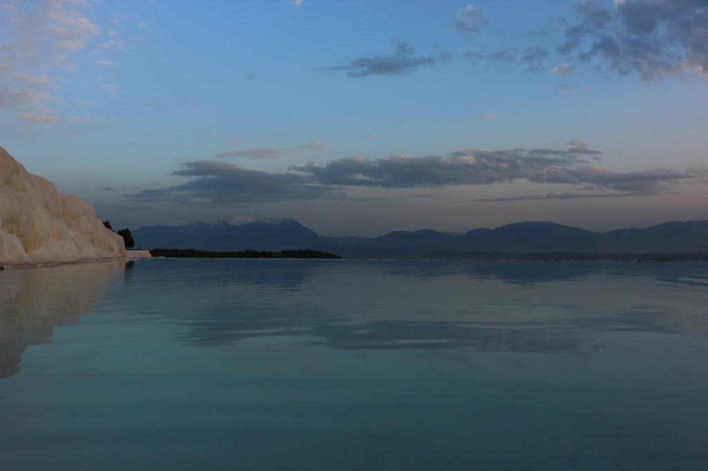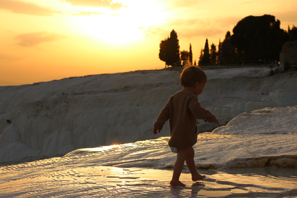 Ab sofort geht es weiter östlich. Wir besuchen Pamukkale, das „Baumwollschloss“. Erst am Eingang der Anlage wird uns bewusst welch großartige historische Stätte neben den touristischen weißen Sinterterrassen liegt. Da wir eben den Nordeingang als Parkplatz wählen, dürfen wir rund drei Kilometer durch riesige Grabanlagen, beeindruckende Tore und ein restauriertes Amphitheater laufen, bevor wir an den warmen Mineralquellen von Pamukkale eintreffen. Hier beginnt der touristische „Spaß“. Der begehbare Teil der weißen Terrassen ist relativ klein und gut gefüllt mit Menschen aller Nationen. Leo macht das nicht viel aus, er watet mit Begeisterung durchs warme Wasser. Die Abendstimmung taucht die Terrassen in warmes Licht und wir versuchen es trotz der vielen Leute zu genießen. Am Ende des Tages sind wir uns Erwachsenen aber einig, dass die antike Stadt Hierapolis uns mehr beeindruckt hat, als die eigentliche Touristenattraktion.