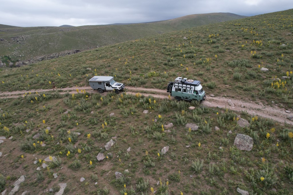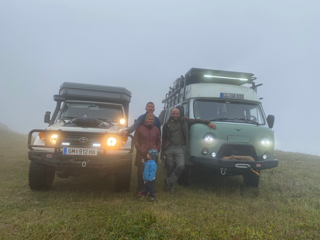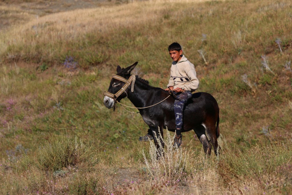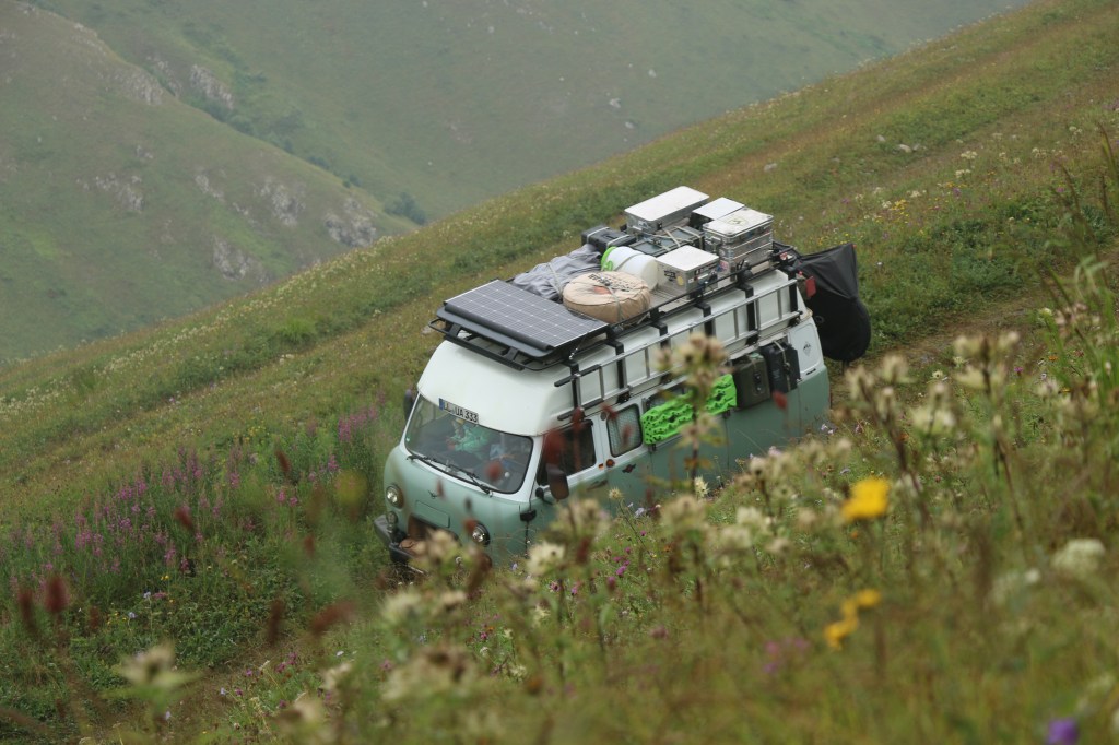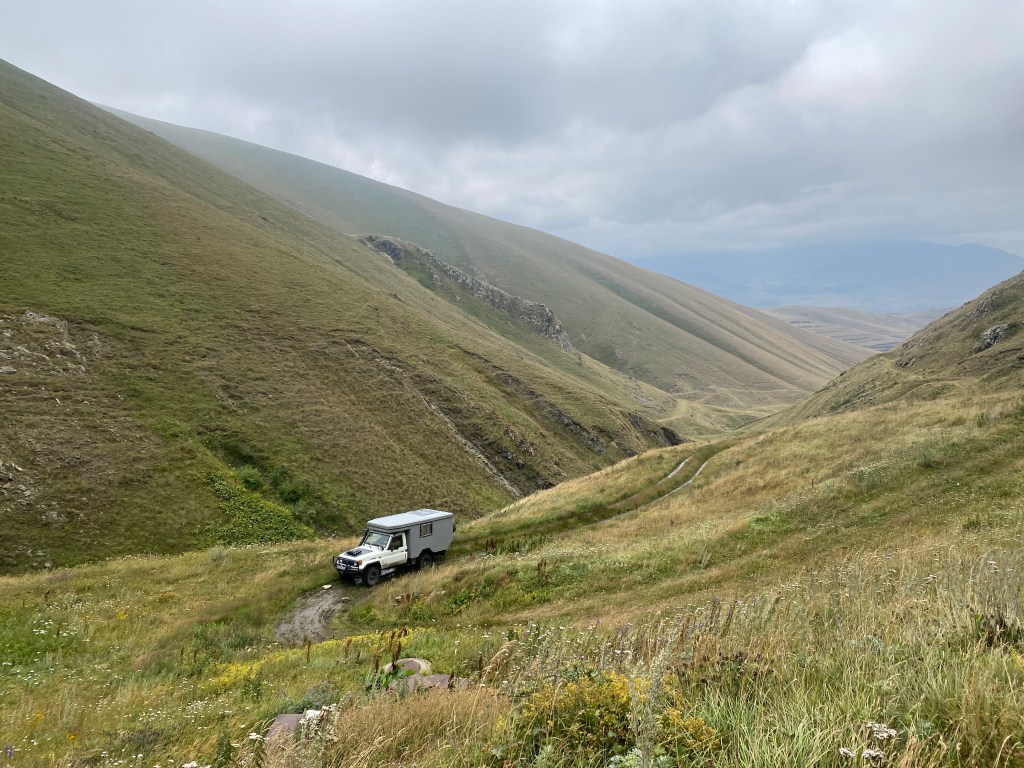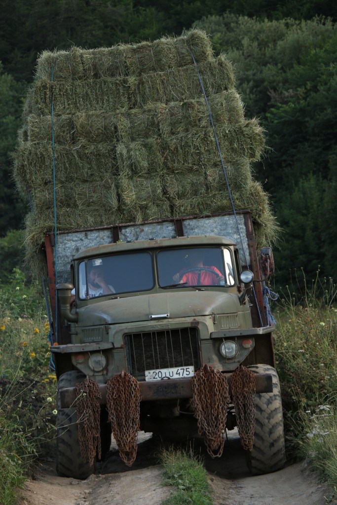 Bis zum Schluss sind wir fasziniert wie schlecht Straßen sein können und trotzdem jeden Tag befahren werden. Wir werden wahrscheinlich nie wieder so viele Fahrzeuge der Marken UAZ und Ural sehen wie auf diesen Straßen. Fast immer sind wir auf über 1500 Höhenmetern unterwegs. Von Beginn an beobachten wir wie beschwerlich Landwirtschaft in hohen Gebirgslagen auch hier ist. Wie es aussieht wenn die Menschen mit der Heugabel schwere Stroh- und Heuballen in schwindligen Höhen auf Lastwägen laden, um sie auf noch steileren Straßen ins Tal zu bringen.