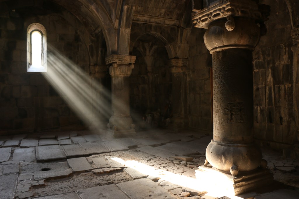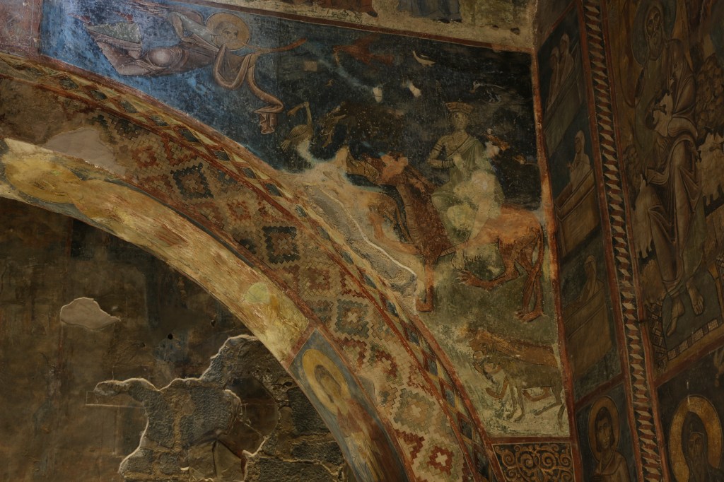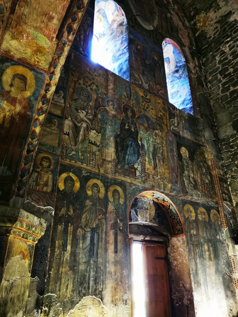 Das Kloster Achtala innerhalb einer Festung ist unsere letzte Sehenswürdigkeit in Armenien. Der Torbogen ist noch erhalten, dahinter tut sich die riesige Muttergotteskirche auf. Im Inneren finden wir die wohl am besten erhaltensten Wandmalereien hier in Armenien. Wir verbringen lange Zeit in der Kirche, Johannes beim Fotografieren. Vom Innenraum her die schönste Kirche, die wir gesehen haben.