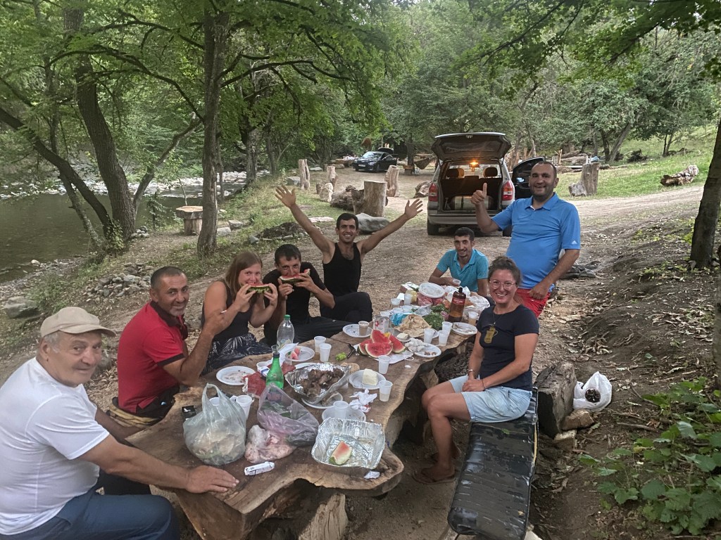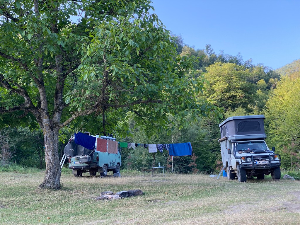 Besonders diese Picknickplätze sind erwähnenswert, denn sie werden oft Verstorbenen gewidmet und liebevoll gehegt und gepflegt. Unsere eindrucksvollste Begegnung in dieser Hinsicht war im Nordosten Armeniens, wo an einem Fluss zwei wunderschöne Plätze eingerichtet wurden. Einer davon für die verstorbene Ehefrau und den sechzehnjährigen Sohn, der andere für den knapp 20 Jahre alten Sohn und seine zwei Freunde, die alle drei vor zwei Jahren im Berg Karabach Konflikt gefallen sind. Der Vater des Soldaten lebt zum Wochenende in einem Zelt am Fluss und baut an einem kleinen Paradies, an dem sich jeder der möchte zum picknicken und baden niederlassen kann. Riesige Tische und Bänke aus Holzstämmen, Feuerstellen, Wasserquellen und sogar eine große selbstgebaute Hängematte umranden die drei Gedenksteine der jungen Männer und einen großen Haufen von herzförmigen Steinen aus dem Fluss. Wir dürfen dem lustigen und fröhlichen Beisammensein einen Samstag lang beiwohnen und finden, es gibt wohl keinen besseren Ort als diesen, um seine Verstorbenen zu ehren.