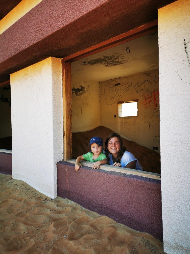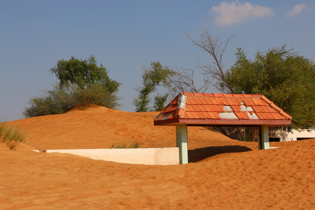 Wir wären nicht wir, würden wir nach so stressigen Tagen nicht sofort in die Natur flüchten. Dubai, Abu Dhabi und die uns noch unbekannte Glitzerwelt der Emirate müssen warten, denn wir verziehen uns erst einmal ein paar Tage in die eher unbebauten Wüstengegenden des Landes. Die erste Nacht in „Freiheit“ verbringen wir bei einem Ghost Town. Es ist ein verlassenes, mittlerweile ziemlich versandetes Dorf, das uns am nächsten Vormittag einen tollen Spielplatz bietet.