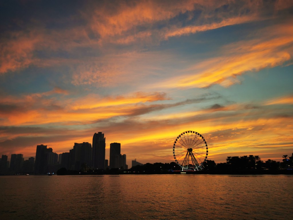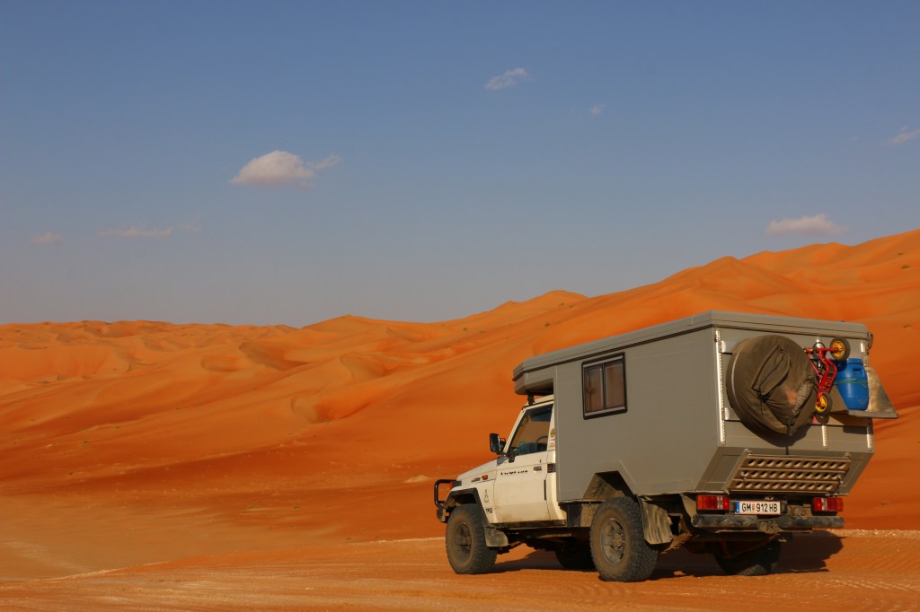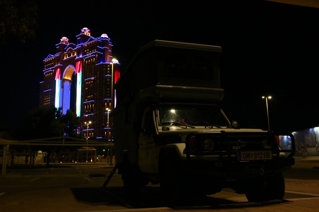 Es ist der 30. November 2022 als unser kleines Zuhause auf einer Fähre am persischen Golf Richtung Sharjah, in den Vereinigten Arabischen Emiraten, schippert. Wir sind einen Tag zuvor mit der Passagierfähre angekommen. Wegen dem Nationalfeiertag, den die Emirate am 2. Dezember feiern, sind alle Hotels überteuert und/oder ausgebucht. Das hätten wir mal lieber vorher recherchiert. Zwei Tage in zwei verschiedenen Hotels in der Stadt, ungewohnte Hitze und Unsicherheit über die Verschiffung unseres Autos, überschatten anfangs unsere Freude über die Ankunft auf der arabischen Halbinsel. Aber wir sind hier, gesund, voller Neugier und nach zwei Tagen warten, sowie einer nervenaufreibenden Auslösung am Hafen, auch wieder im Besitz unseres Zuhauses.