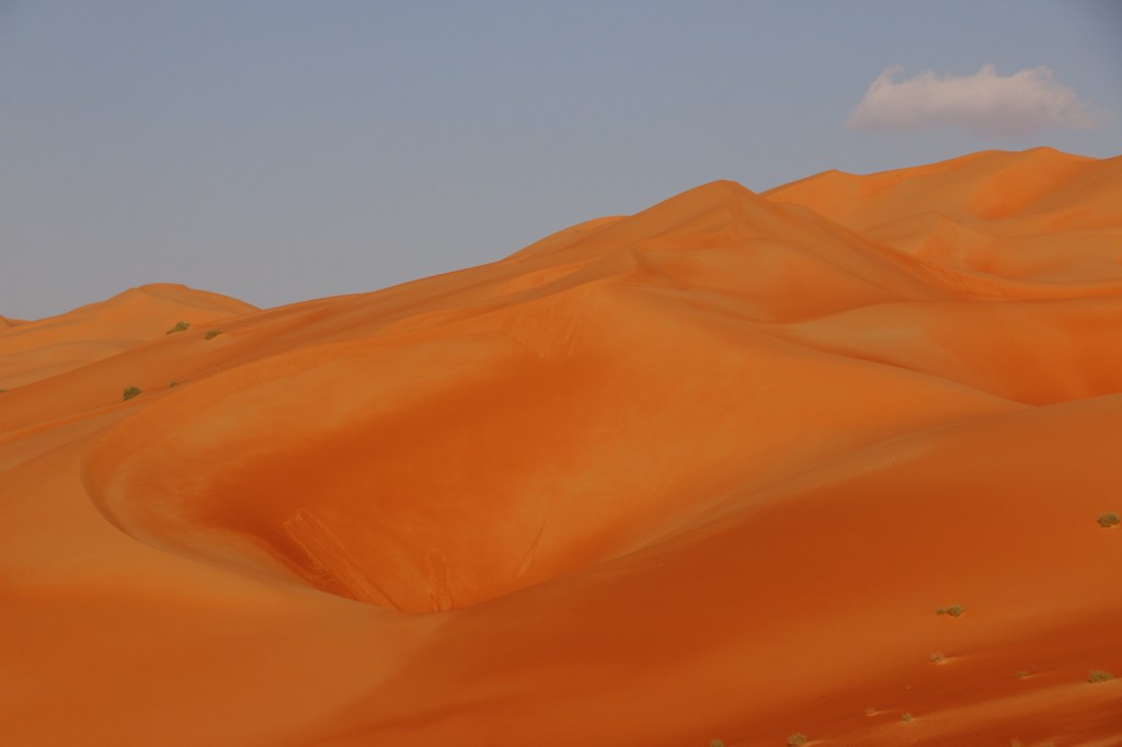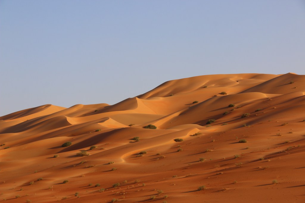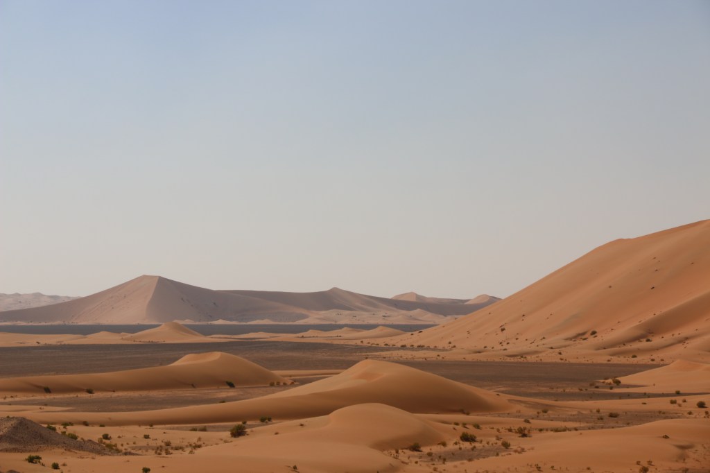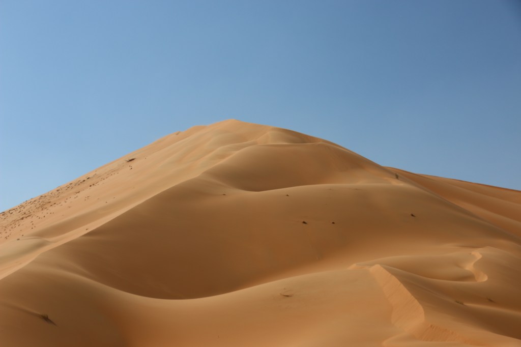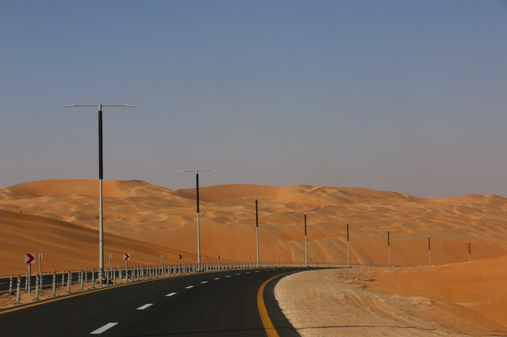 Die Rub Al Khali ist die größte Sandwüste der Welt und beherbergt auf zwei Drittel ihrer Fläche Sanddünen mit einer Höhe von bis zu 300 Metern. Ihr Name bedeutet „leeres Viertel“ und dieser macht ihr auf dem Weg von Al Ain nach Liwa kurzzeitig alle Ehre. Wir befinden uns nur in den Ausläufern der Rub Al Khali, der Großteil dieser Wüste ist in Saudi Arabien. Somit werden wir auf dieser Reise noch ein paar Mal mit ihr in Berührung kommen. Die erste Erfahrung ist definitiv lustig und positiv. Denn wenn die E90, die wirklich gut asphaltierte Hauptverbindungsroute Richtung Liwa, plötzlich zum Sandspielplatz wird und man nach einer normalen Steigung der Straße den Allrad inkl. Untersetzung und Differenzialsperren braucht, ist wohl klar, dass man nicht mehr viel von der Straße darunter sieht. Die Gebäude am Straßenrand alle verlassen, kaputt und verwildert. Auf diesen rund zwanzig Kilometern ist die Strecke komplett zugeweht, besteht nur aus Sand. Die Fahrt macht aber gerade deswegen viel Spaß, denn so nah waren wir so hohen Dünen noch nie. Wir genießen die Gegend und die Gastfreundschaft der Einheimischen für zwei Tage in der Nähe von Liwa, gönnen uns noch einen Strandtag und fühlen uns danach bereit für die Stadt.