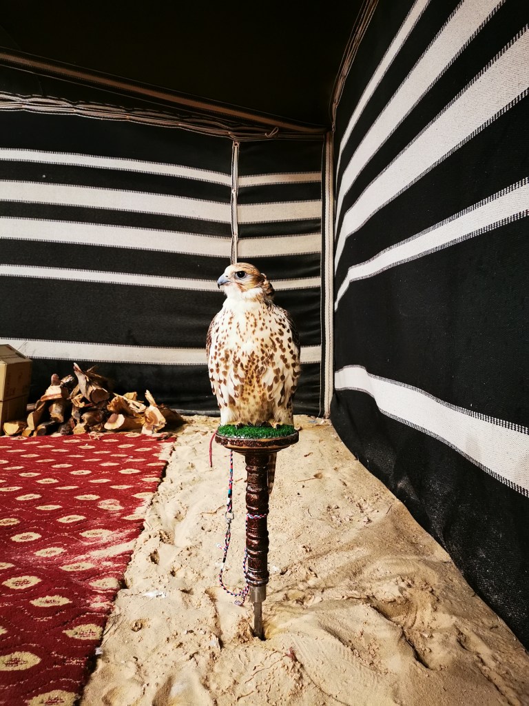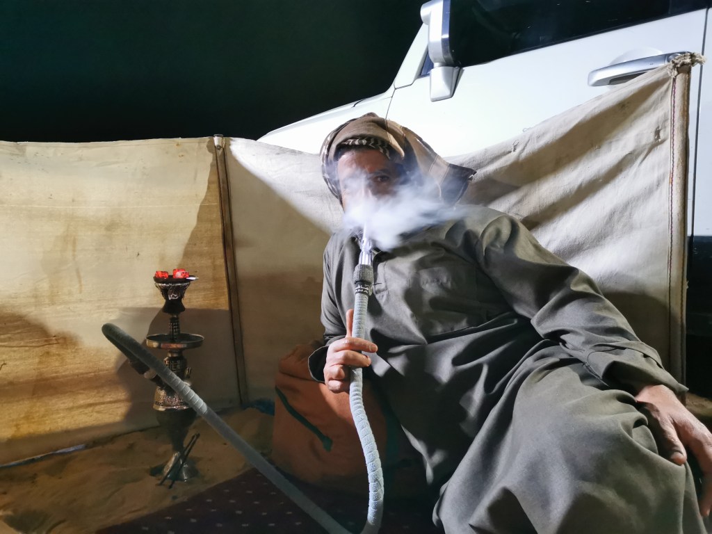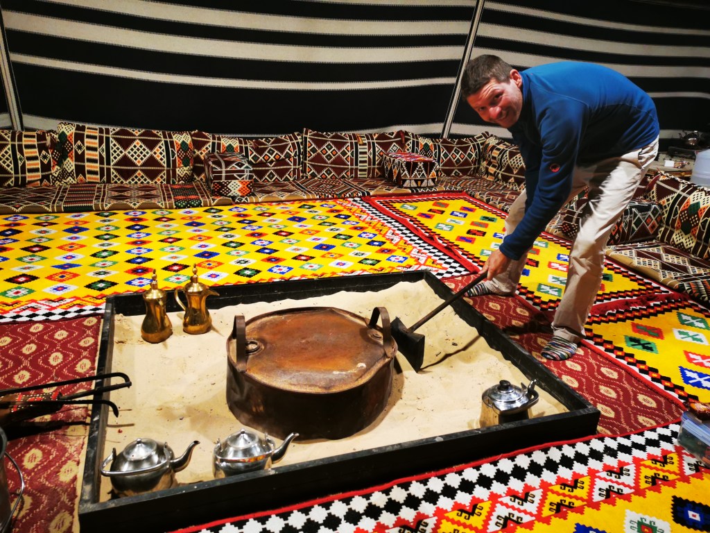 An Wochenenden wird von Vielen das Leben in der Wüste, der Natur zelebriert. Hauptsächlich Gruppen von Männern, aber auch Familien dürfen wir dabei beobachten, ja eigentlich mit ihnen erleben, wie sie ihre Lager auf bunt gemusterten Teppichen und Polstern einrichten. Sie sitzen am Feuer, es wird Kaffee und Tee getrunken, Wasserpfeife geraucht, viel geredet und gelacht. Teilweise auch gecampt, in Zelten oder unter dem freien Sternenhimmel. Es gibt große Outdoorshops, die wirklich alles was das Camperherz begehrt, anbieten. Vom Outdoorteppich in typischen Mustern, übers Kaffeetassenetui, oder dem elektrischen Kochtopf, zu Taschen für die Teekannen oder die metallenen Anrichteplatten. Ganze Einrichtungs- und Ordnungssets für die Kofferräume der hier viel gefahrenen Toyotas.