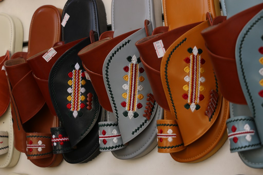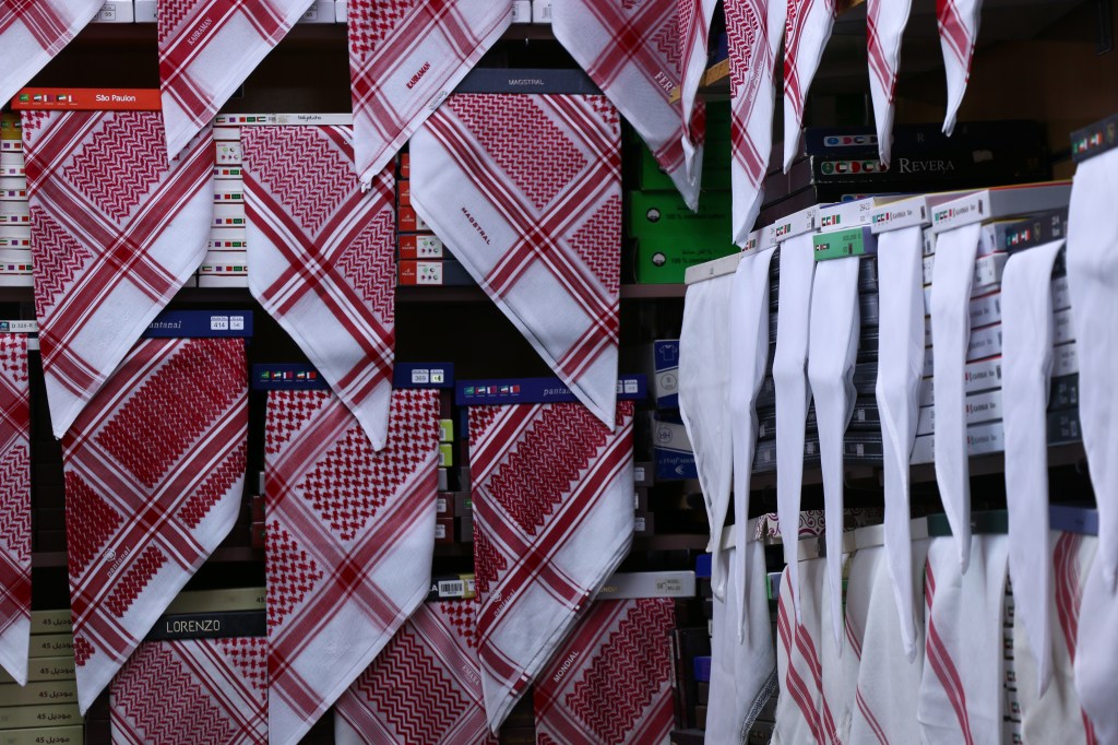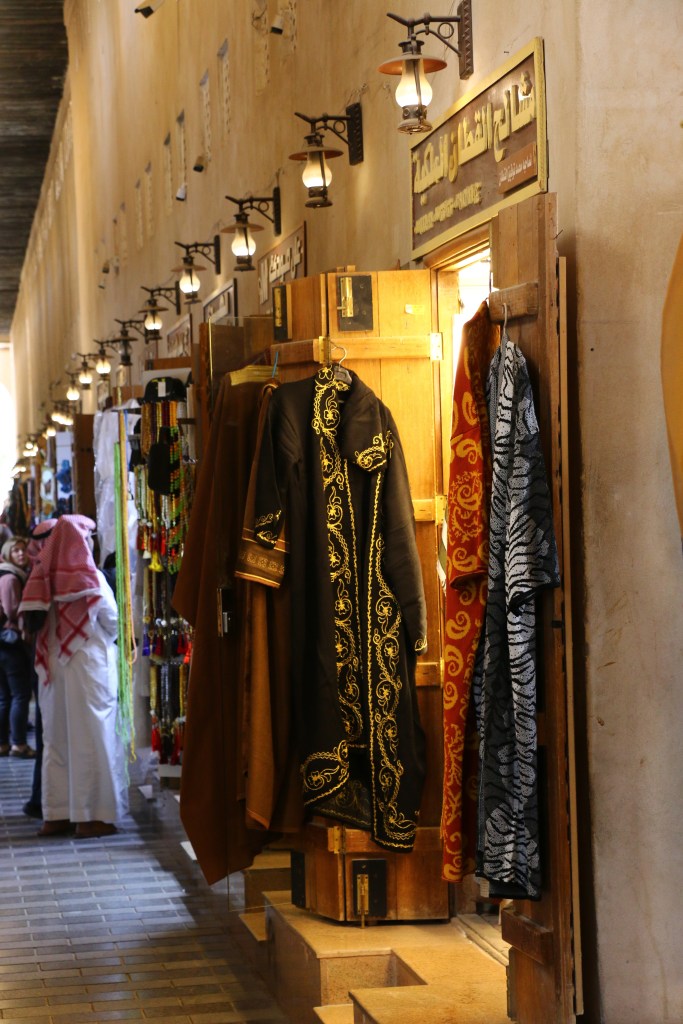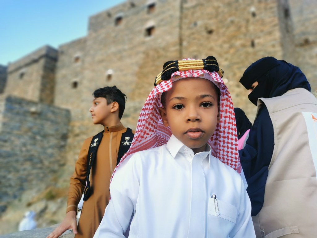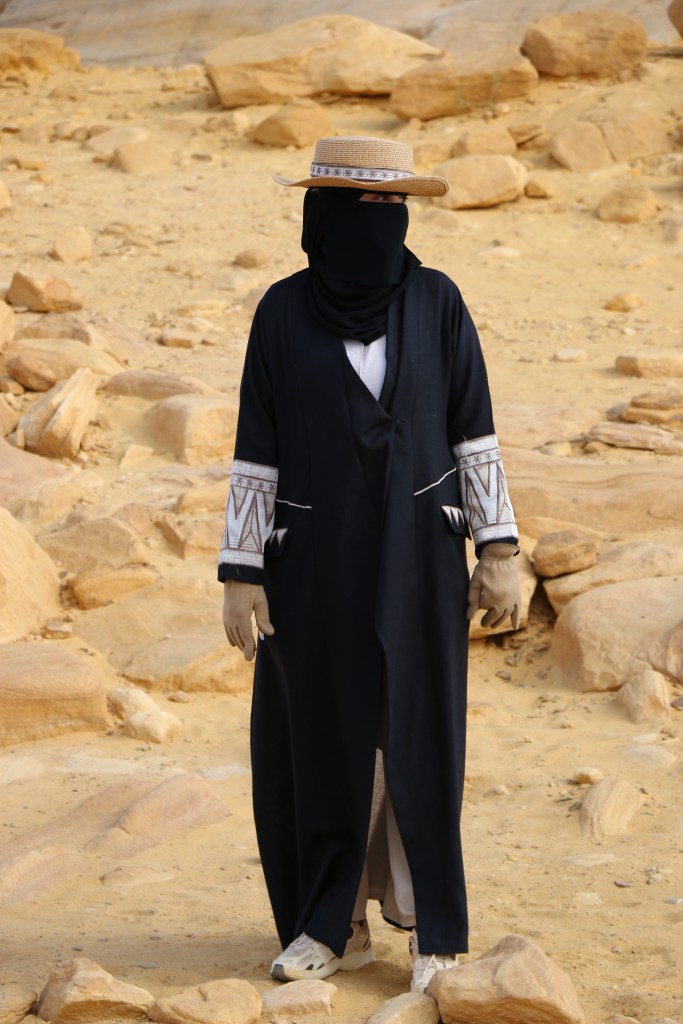 Eine Reise quer durch Saudi-Arabien ist ein andauernder Wechsel von Tradition und Moderne. Männer tragen in der Regel die Thobe, ein traditionelles, langärmeliges Gewand. Je nach Witterung wird Baumwolle, Wolle oder auch Synthetik getragen. Im Winter z.B. auch lange Unterhosen darunter. Die Ghutra, die Kopfbedeckung spielt ebenso eine große Rolle und wird viel getragen. Traditionell wird sie mit einer schwarzen Kordel zusammengefasst. Auf den Straßen sieht man nicht nur das traditionelle rot-weiße Tuch, es gibt schier unendlich viele Muster und Binde- bzw. Faltvariationen zu sehen. Johannes wird von Ahmeds Freund, der Kleidung herstellt, einmal komplett eingekleidet, inklusive maßgeschneidertem Qamis. Ebenso Leo, der sich aber vehement weigert sein Kleidungsstück anzuziehen. Schon im Oman sahen wir viele Menschen in Lederschlappen, was hier in Saudi Arabien ähnlich ist. Manchmal bekommt man sogar fußballspielende Jungs in ihrem langen Kleid zu Gesicht, der Rock wird einfach ein Stück nach oben gezogen. Frauen sind meist vollverschleiert, tragen hauptsächlich schwarz. Durch den freien Schlitz an den Augen blitzen einem immer freundliche, dunkle Augen entgegen. Die Handtasche, der Schmuck oder auch der Stoff und die Verzierung des Umhangs lassen trotz der gleich wirkende Textilie auf den gesellschaftlichen Status schließen. In den großen Städten ist es oft nur die Abaya, ein lange Robe oder Umhang, die über der sonst modernen Kleidung getragen wird. Dort sehen wir zum Teil auch unverschleierte Frauen, manchmal mit Kopftuch, manchmal ohne. 2019 führte Saudi-Arabien das „Öffentliche Anstandsrecht“ ein, in welchem aufgeführt ist, was in der Öffentlichkeit für Männer und Frauen als angemessene Kleidung gilt, und was nicht. Araber*innen legen egal ob Mann oder Frau besonders Wert auf ihr Erscheinungsbild, auch Parfüm spielt eine große Rolle.