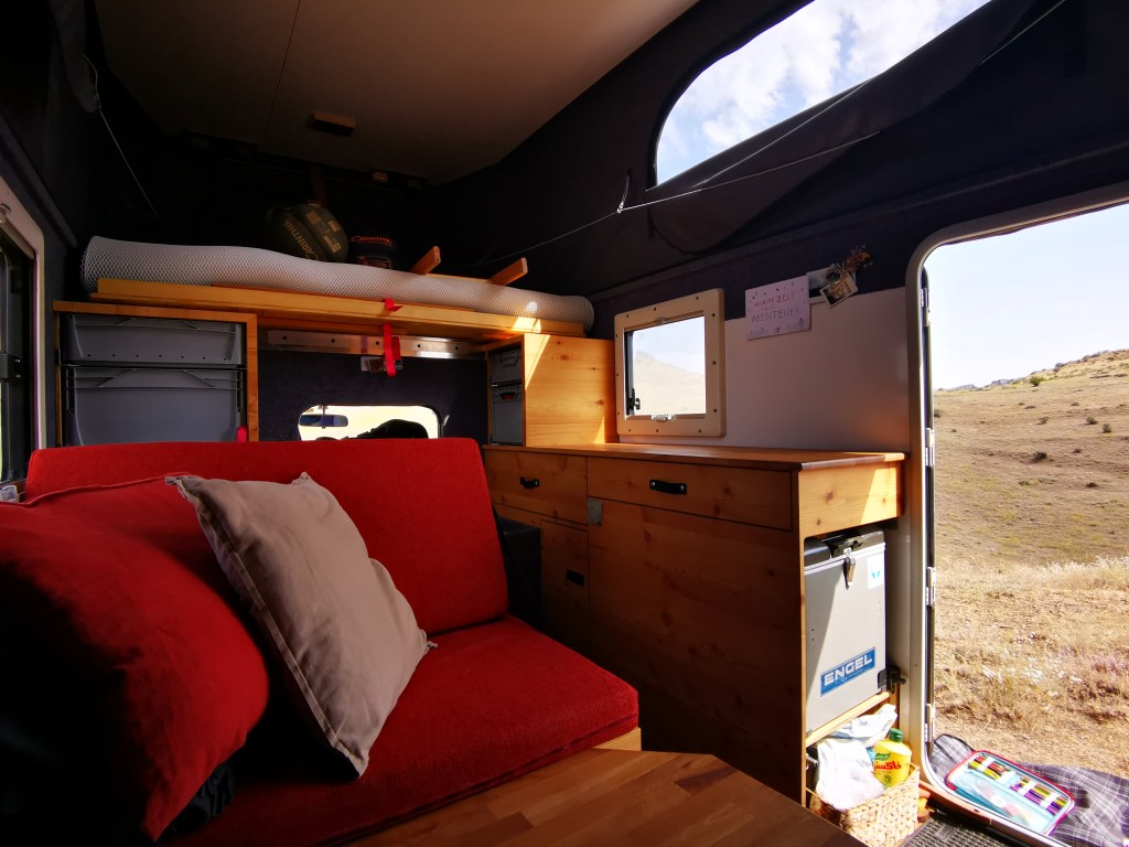 Wir haben viel Stauraum, einen ausziehbaren Kühlschrank und eine kleine Küchenzeile. Gekocht wird grundsätzlich aber draußen mittels Benzinkocher.