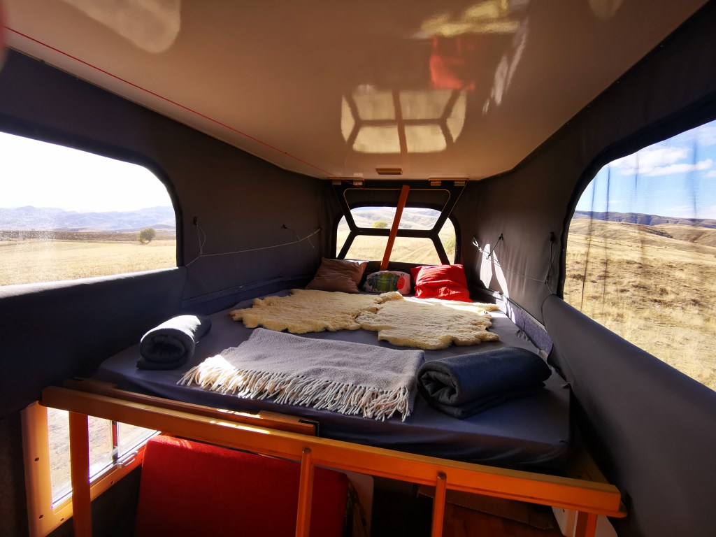 Unser Bett kann auf eine Größe von 165cm x 220 cm ausgezogen werden. Zusätzlich können wir unseren Sitzbereich mit vier Sitzplätzen zu einem zweiten Bett mit 100 cm x 190 cm umbauen, um auch windige Nächte gut zu überstehen.